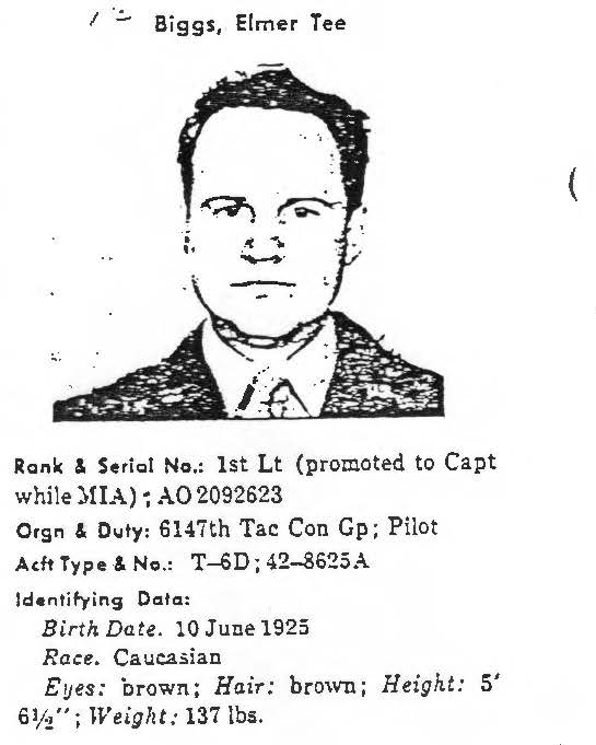 On January 3, 1952, a T-6 Mosquito (serial number 42-8625A, call sign "Anaconda 3") carrying one crew member and one Army observer, left Osan Air Base, Pyeongtaek, South Korea, on a tactical reconnaissance mission north of Chorwon, North Korea. The T-6 was hit by anti-aircraft fire while over the "Iron Triangle" area, and the observer parachuted out and was later rescued by a helicopter. The pilot was still inside the aircraft when it crashed, and an observer in another aircraft saw that the pilot was thrown clear of the wreck, attempt to rise but fell back to the ground and was immediately surrounded by enemy soldiers. He remains missing in action. Captain Elmer Tee Biggs, who joined the U.S. Air Force from Georgia, served with the 6148th Tactical Control Squadron, 6147th Tactical Control Group. On January 3, 1952, he was the pilot of this T-6 when it crashed over the "Iron Triangle" area on January 3, 1952. Capt Biggs was in the aircraft when it crashed, survived and was thrown clear of the wreck, but was surrounded by enemy soldiers. No returning POWs mentioned having contact with Capt Biggs, nor was he seen at any known holding point, interrogation center, hospital, or permanent POW camp. He is believed to have died of his injuries shortly after capture, and he remains unaccounted-for. Today, Captain Biggs is memorialized on the Courts of the Missing at the National Memorial Cemetery of the Pacific. Based on all information available, DPAA assessed the individual's case to be in the analytical category of Deferred. If you are a family member of this serviceman, DPAA can provide you with additional information and analysis of your case. Please contact your casualty office representative. |