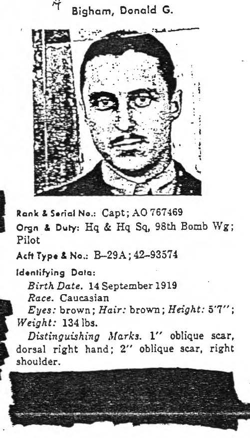 On January 9, 1951, a B-29A Superfortress (tail number 42-93974) carrying twelve crew members took off from Yokota Air Base, Japan, on a night leaflet dropping mission with ten scheduled drops over Pyongyang, Sinan-ju, Anju, Pakchon, Chong-ju, Namsi, Kosong, Pukchin, Huichon, and Tokchon. While approaching Namsi, this aircraft took multiple direct hits from enemy anti-aircraft fire and was severely damaged. Tentatively regaining control of the aircraft, the pilot headed for Paengnyong-do Island off the west coast of North Korea, which was under friendly control. Continuing to fight for control, the pilot put the aircraft in a circular orbit over the island, and all twelve members of the crew, including the pilot, reportedly were able to bail out. The B-29 then went out of control and crashed on the island. Ten of the crew landed on the island; another landed in the water and paddled his survival raft to shore, while the pilot could not be located following the incident. Captain Donald Gaile Bigham entered the U.S. Air Force from Arizona and was assigned to 342nd Bombardment Squadron, 98th Bombardment Wing (Medium). He was on temporary duty assignment with the 343rd Bombardment Squadron, 98th Bombardment Wing, and was the pilot of this bomber at the time of its loss. He reportedly bailed out and made a water landing, but was not able to be located at the time. An extensive aerial and water surface search located the wreckage of the aircraft, but the pilot was not found. No returning POWs mentioned having contact with Capt Bigham, nor was he seen at any known holding point, interrogation center, hospital, or permanent POW camp. His remains were not recovered or identified following the conflict and he is still unaccounted-for. Today, Captain Bigham is memorialized on the Courts of the Missing at the National Memorial Cemetery of the Pacific Based on all information available, DPAA assessed the individual's case to be in the analytical category of Deferred. If you are a family member of this serviceman, DPAA can provide you with additional information and analysis of your case. Please contact your casualty office representative. |
