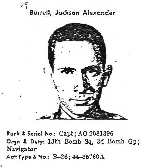 lists them as "unaccounted for". Names and ranks only were released at the time, and printed in "The Spotlight" on August 27, 1979, along with the above information and background. Further information has been compiled by the P.O.W. Network from the Hawaii POW/MIA Korean Memorial records, National Archives documentation, and public United States Air Force documentation, and changes made to the original published information. (FEBRUARY 1992) Jackson Burrell is listed on the "HONOR ROLL OF FORGOTTEN AMERICANS" yet is noted as having died "while missing" by the National Archive. |
