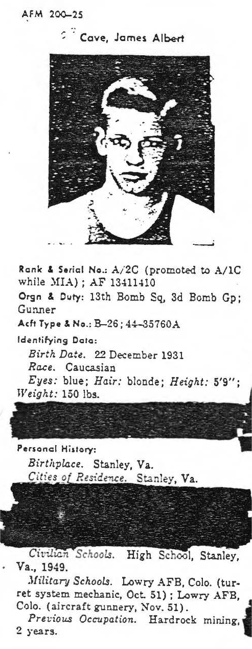 Data Sources - Air Force Manual No. 200-25A, Department of the Air Force, Washington, October 16, 1961 page 1. Sanitized copy. National Archives KOREAN Conflict Casualty File (KCCF) 1950-1954. MIAs in incident; Trantham, Archie Peyton; Burrell, Jackson Alexander;