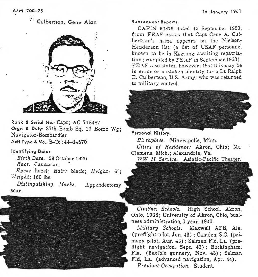 information. (FEBRUARY 1992) Gene Culbertson is listed on the "HONOR ROLL OF FORGOTTEN AMERICANS" yet is noted as having died "while missing" by the National Archive. |