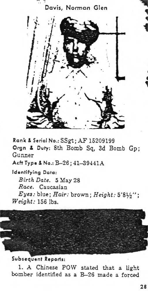 information. (FEBRUARY 1992) Norman Davis is listed on the "HONOR ROLL OF FORGOTTEN AMERICANS" yet is noted as having died "while missing" by the National Archive. |