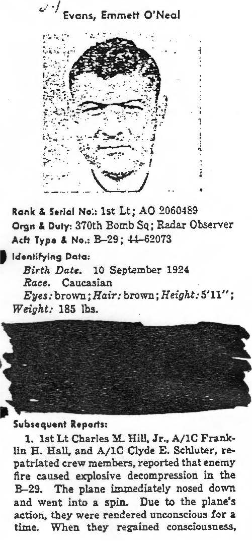 information. (FEBRUARY 1992) Emmett O'Neal EVANS is listed on the "HONOR ROLL OF FORGOTTEN AMERICANS" yet is noted as having died "while missing" by the National Archive. |