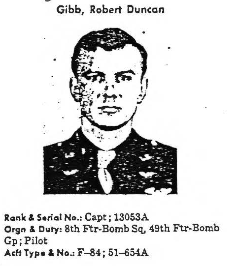 Captain Robert Duncan Gibb entered the U.S. Air Force from Michigan and served with the 8th Fighter Bombardment Squadron, 49th Fighter Bombardment Group. On December 16, 1951, he was the pilot of an F-84E Thunderjet (tail number 51-654A) when it departed Taegu Air Base, South Korea, in the last position of a flight of four aircraft on an interdiction mission against enemy targets in the Yang-Dok area of South Pyongan Province, North Korea. Following its second pass over a target, Capt Gibb's Thunderjet failed to rejoin its formation. Attempts at radio contact with him were unsuccessful, and there were no sightings reported that he bailed out or crashed. Because the enemy activity in the target area was active at the time of his loss, it prevented any ground search efforts for Capt Gibb or his possible aircraft wreckage. No returning POWs mentioned having contact with Capt Gibb, nor was he seen at any known holding point, interrogation center, hospital, or permanent POW camp, and he remains unaccounted-for following the incident. Today, Captain Gibb is memorialized on the Courts of the Missing at the National Memorial Cemetery of the Pacific. Based on all information available, DPAA assessed the individual's case to be in the analytical category of Deferred. If you are a family member of this serviceman, DPAA can provide you with additional information and analysis of your case. Please contact your casualty office representative. |