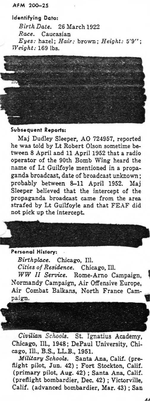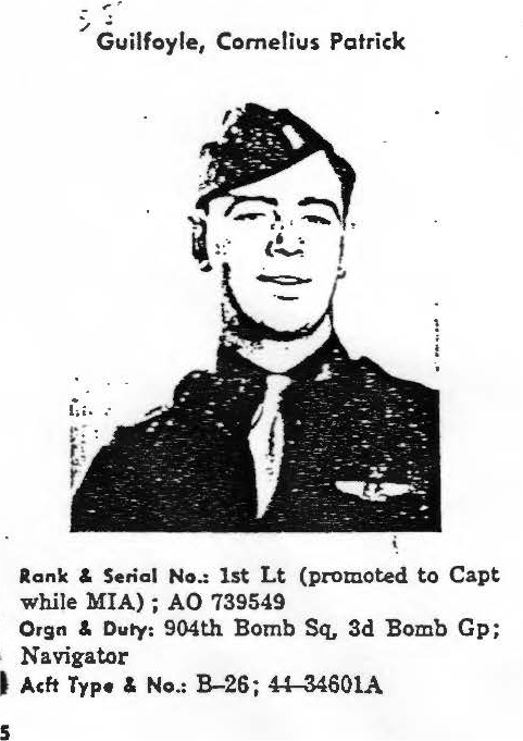 information. (FEBRUARY 1992) Cornelius Guilfoyle is listed on the "HONOR ROLL OF FORGOTTEN AMERICANS" yet is noted as having died "while missing" by the National Archive. |