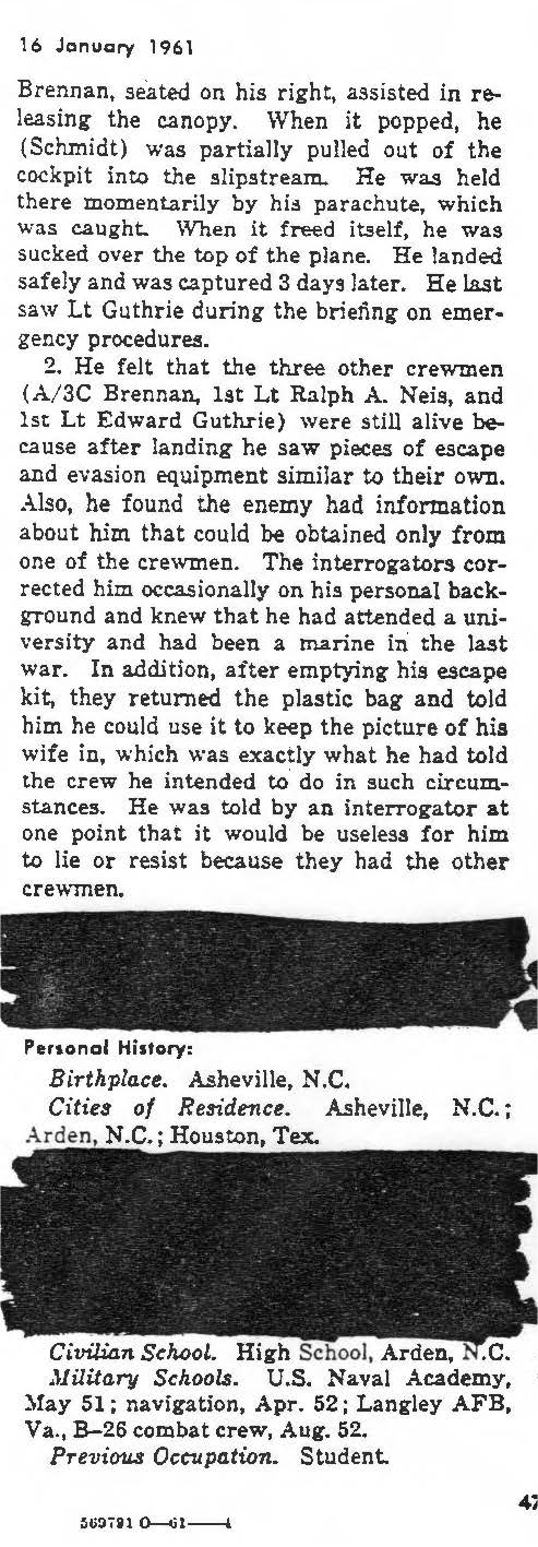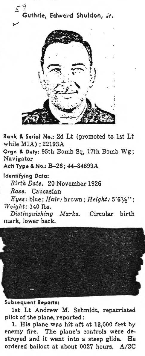 Others in incident; Schmidt, Andrew, repatriated; Guthrie, Edward Shuldon Jr.; Brennan, John Charles; Neis, 1st Lt Ralph A.