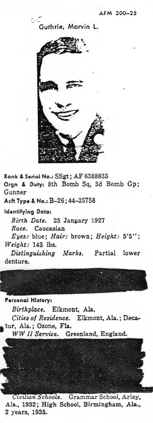 information. (FEBRUARY 1992) Marvin Guthrie is listed on the "HONOR ROLL OF FORGOTTEN AMERICANS" yet is noted as having died "while missing" by the National Archive. |