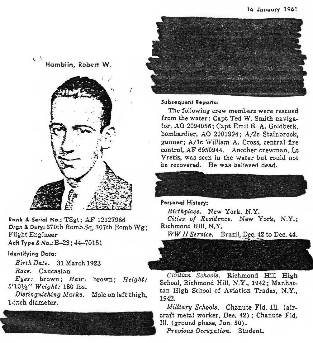 MIAs in the Incident; West, Carl Emmons; Webb, Edward Arvil; Hamblin, Robert W.; O'Neal, Julius Elliot; Wahlgren, Edward Charles; Penninger, Roger William; Shields, Thomas L.