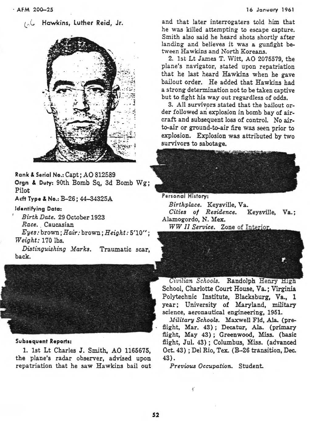 Data Sources - Air Force Manual No. 200-25A, Department of the Air Force, Washington, October 16, 1961 page 1. Sanitized copy. National Archives KOREAN Conflict Casualty File (KCCF) 1950-1954.