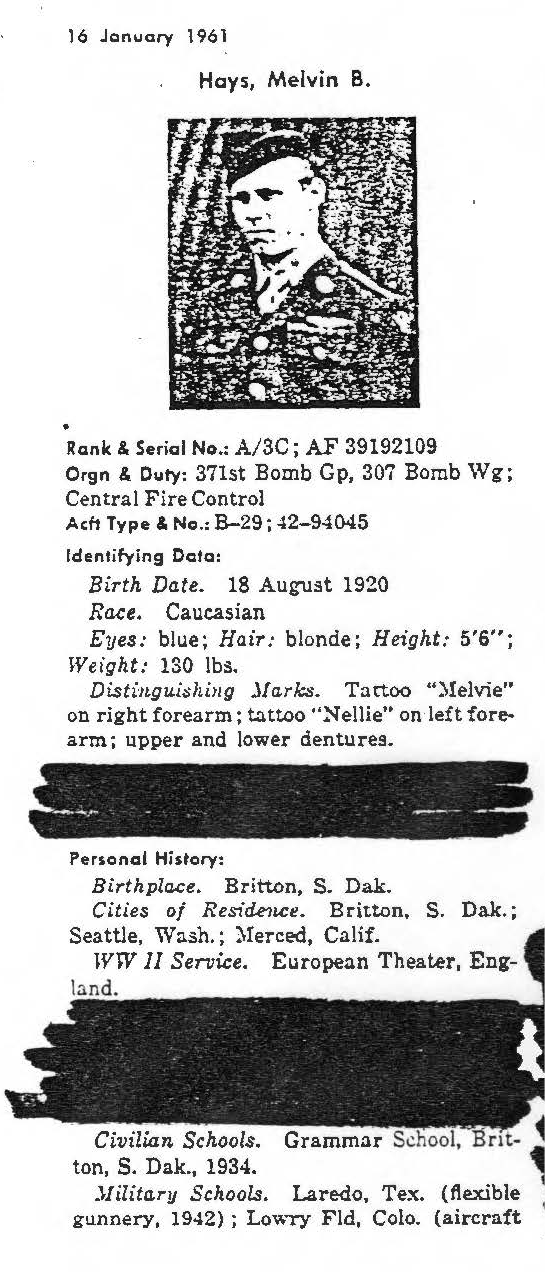 information. (FEBRUARY 1992) Melvin Hays is listed on the "HONOR ROLL OF FORGOTTEN AMERICANS" yet is noted as having died "while missing" by the National Archive. |