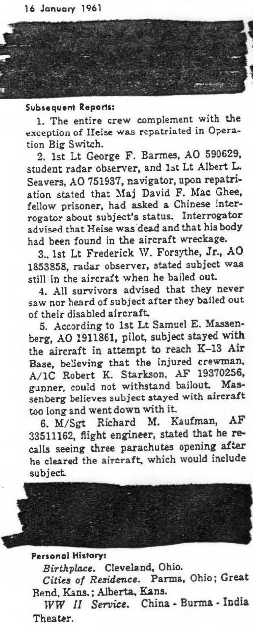 information. (FEBRUARY 1992) Arthur Heise is listed on the "HONOR ROLL OF FORGOTTEN AMERICANS" yet is noted as having died "while missing" by the National Archive. |