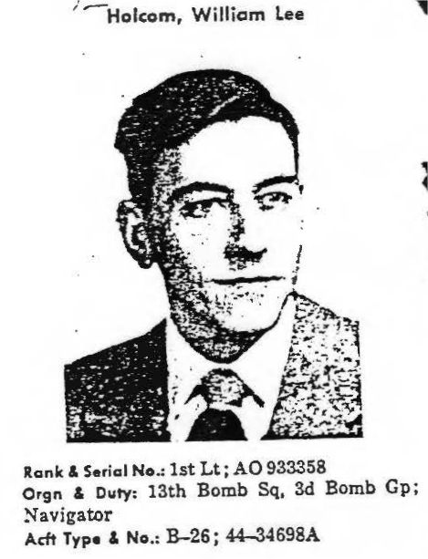 Mid-evening of August 7, 1952, a B-26 Invader (tail number 44-34698, call sign "Pintail 04") departed Kunsan (K-8) Air Base with a crew of three aviators. The briefed mission night intruder operation targeting enemy supply routes south of Pyongyang. The pilot of another Invader operating near Sinchon reported hearing the pilot of Pintail 04 radio that his aircraft was badly damaged and he was unsure if it would be able to return to base. Shortly after Pintail 04 was cleared out of the target area, the pilot was heard giving the order to bail out. The crew of Pintail 04 was not seen or heard from again. We have no information that anyone from this crew was ever in enemy hands. First Lieutenant William Lee Holcom, who joined the U.S. Air Force from Iowa, was assigned 13th Bombardment Squadron, 3rd Bombardment Wing. He was the navigator aboard this B-26 went missing, and he was lost in the incident. No returning POWs mentioned having contact with 1st Lt Holcom, nor was he seen at any known holding point, interrogation center, hospital, or permanent POW camp. His remains were not identified among those returned to U.S. custody after the ceasefire and 1st Lt Holcom is still unaccounted-for. Today, First Lieutenant Holcom is memorialized on the Courts of the Missing at the National Memorial Cemetery of the Pacific. Based on all information available, DPAA assessed the individual's case to be in the analytical category of Deferred. If you are a family member of this serviceman, DPAA can provide you with additional information and analysis of your case. Please contact your casualty office representative.