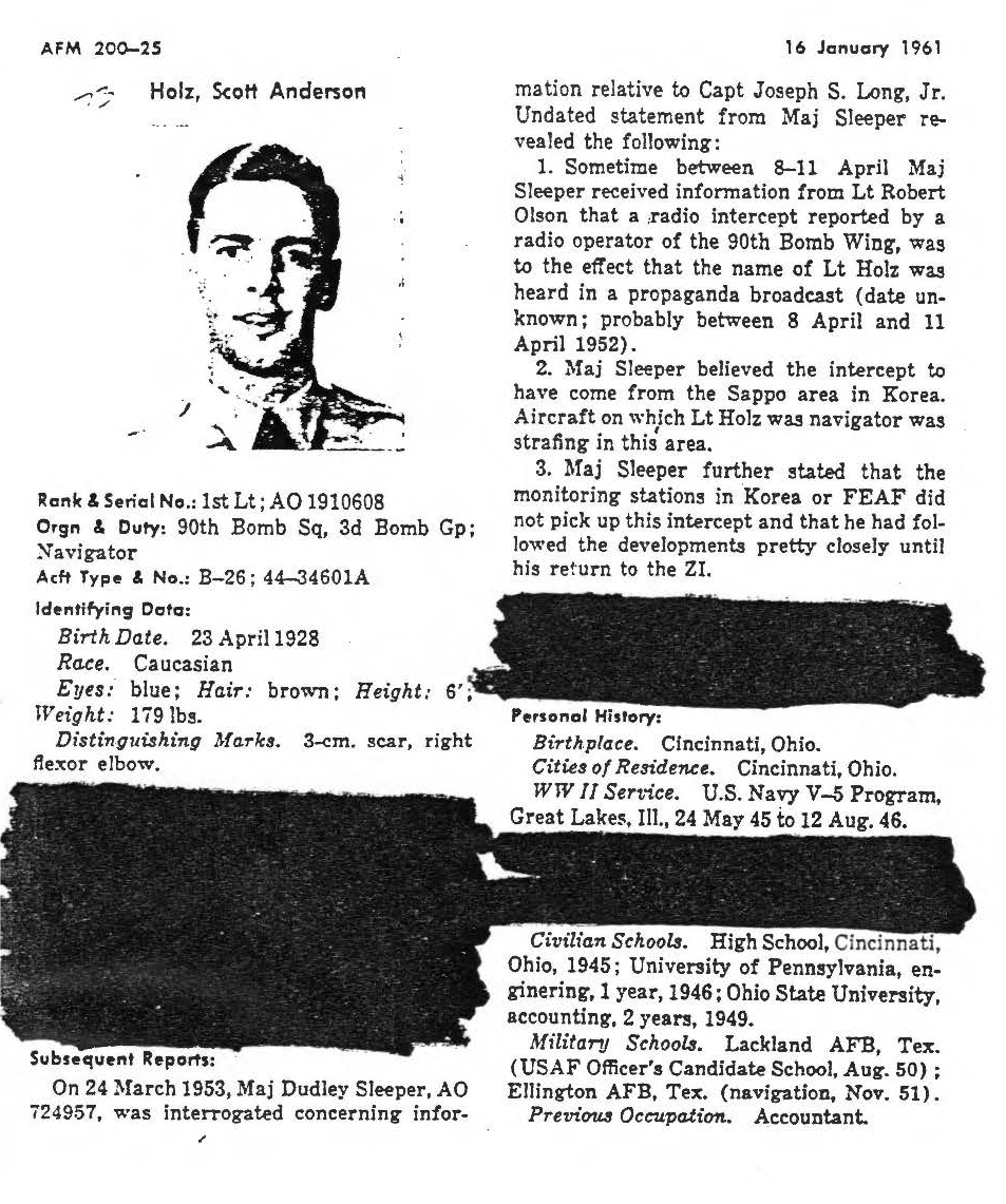 Scott Holz is listed on the "HONOR ROLL OF FORGOTTEN AMERICANS" yet is noted as having died "while missing" by the National Archive. |