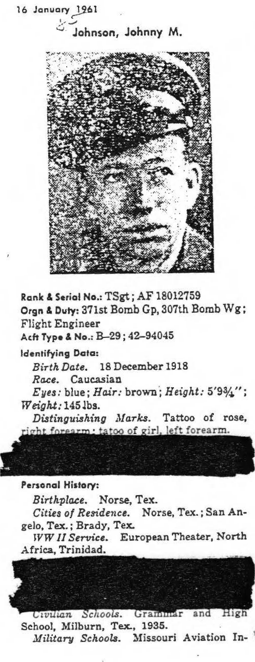 information. (FEBRUARY 1992) Johnny Johnson is listed on the "HONOR ROLL OF FORGOTTEN AMERICANS" yet is noted as having died "while missing" by the National Archive. |