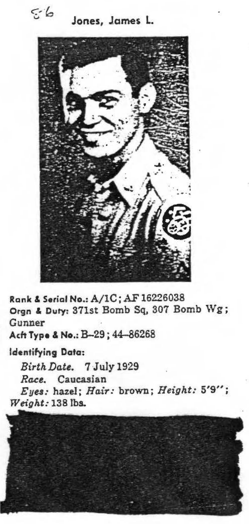 information. (FEBRUARY 1992) James Jones is listed on the "HONOR ROLL OF FORGOTTEN AMERICANS" yet is noted as having died "while missing" by the National Archive. |