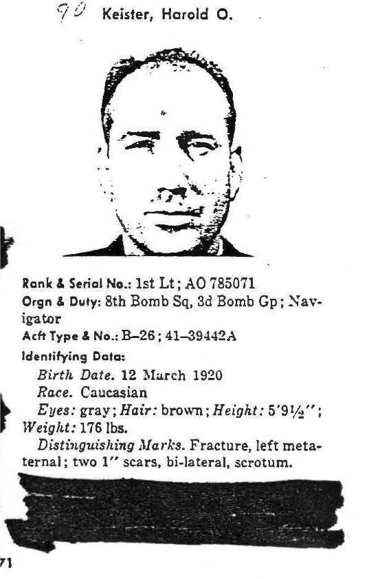 information. (FEBRUARY 1992) Harold Keister is listed on the "HONOR ROLL OF FORGOTTEN AMERICANS" yet is noted as having died "while missing" by the National Archive. |
