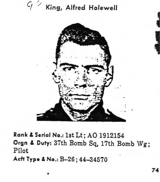 Just before midnight on February 23, 1953, a B-26B Invader (tail number 44-34570, callsign "Dutchboy 94") departed Pusan East (K-9) Air Base, Korea, with three crew of three. The briefed mission was a night intruder operation targeting the enemy supply line known as Black 16, which ran between Songjin and Chongjin. After making a series of very low altitude bomb runs on an enemy train operating above northeast Hungnam, the Invader disappeared for unknown reasons. No trace of "Dutchboy 94" could be found and all efforts to establish radio contact with the crew were unsuccessful. The missing aviators were listed as missing in action and were not seen again. First Lieutenant Alfred Holowell King, who entered the U.S. Air Force from Virginia, was assigned to the 37th Bombardment Squadron, 17th Bombardment Group. He was the pilot of this B-26 at the time of its loss. No returning POWs mentioned having contact with 1st Lt King, nor was he seen at any known holding point, interrogation center, hospital, or permanent POW camp. He remains unaccounted-for. Today, First Lieutenant King is memorialized on the Courts of the Missing at the National Memorial Cemetery of the Pacific. Based on all information available, DPAA assessed the individual's case to be in the analytical category of Deferred. If you are a family member of this serviceman, DPAA can provide you with additional information and analysis of your case. Please contact your casualty office representative. |