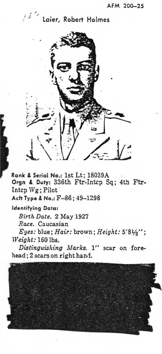 Captain Robert Holmes Laier entered the U.S. Air Force from Nebraska and served with the 336th Fighter-Interceptor Squadron, 4th Fighter-Interceptor Group. On June 19, 1951, he piloted an F-86A Sabre (tail number 49-1298) that took off from Suwon Air Base as the second in a flight of four F-86s on a fighter sweep mission over Sinuiju, North Korea, in an area known as “MiG Alley.” During the mission, Capt Laier's Sabre was attacked by two MiG-15s, causing his plane to go into a steep dive near the village of Sinsi-ri. The final circumstances surrounding Capt Laier’s loss were not observed, and it is unknown whether he ejected. An aerial search that followed this loss observed three fires from undetermined aircraft in the area where Capt Laier’s F-86 was last seen; however, there was no sign of the missing pilot. No returning POWs mentioned having contact with Capt Laier, nor was he seen at any known holding point, interrogation center, hospital, or permanent POW camp. He remains unaccounted-for. Today, Captain Laier is memorialized on the Courts of the Missing at the National Memorial Cemetery of the Pacific. Based on all information available, DPAA assessed the individual's case to be in the analytical category of Deferred. If you are a family member of this serviceman, DPAA can provide you with additional information and analysis of your case. Please contact your casualty office representative.
