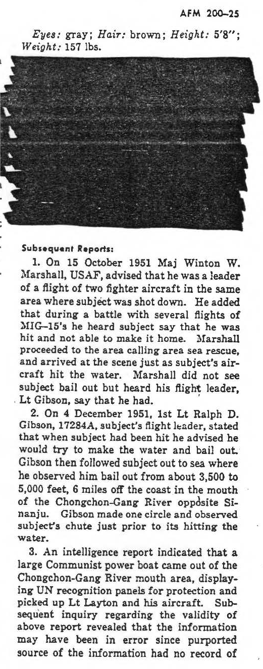 Table 2. BNR Cases Where Death Was Witnessed by ....... __________ 31 Missing USAF F-86 Pilots whose Loss Name Date of Casualty 1. Cpt William D. Crone 18 Jun 51 Source: USAF Casualty Affairs .... 3. Pilot: 1st Lieutenant Laurence C. Layton, USAFR Minutes after arriving in the target area, the flight engaged |