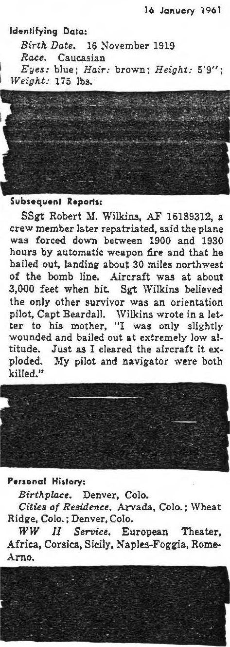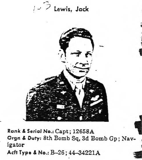 information. (FEBRUARY 1992) Jack Lewis is listed on the "HONOR ROLL OF FORGOTTEN AMERICANS" yet is listed by the National Archive as having "died while missing." |