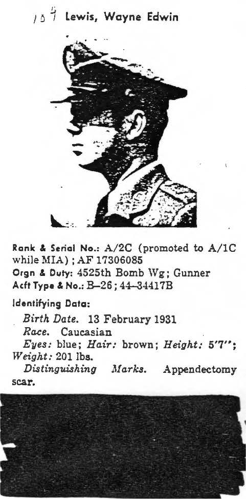 information. (FEBRUARY 1992) Wayne Lewis is listed on the "HONOR ROLL OF FORGOTTEN AMERICANS" yet is noted as having died "while missing" by the National Archive. |