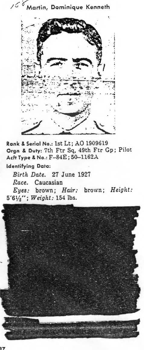 First Lieutenant Dominique Kenneth Martin entered the U.S. Air Force from Maine and served with the 7th Fighter-Bomber Squadron, 79th Fighter-Bomber Group. On May 5, 1952 he piloted an F-84 Thunderjet (tail number 50-1162A) that took off from Taegu Air Base in the lead position of a flight of three aircraft on an interdiction mission against a rail line south of Huichon, Korea. His aircraft was hit by machine gun fire while over the target and he was forced to bail out before it crashed. Witnesses saw him land on the ground, fold his parachute and disappear into nearby foliage. His flight members remained overhead searching for him until their fuel ran low; however, 1st Lt Martin could not be located. The following day, another aerial search was conducted, but was unsuccessful. No returning POWs mentioned having contact with 1st Lt Martin, nor was he seen at any known holding point, interrogation center, hospital, or permanent POW camp. He remains unaccounted-for after the ceasefire. Today, First Lieutenant Martin is memorialized on the Courts of the Missing at the National Memorial Cemetery of the Pacific. Based on all information available, DPAA assessed the individual's case to be in the analytical category of Deferred. If you are a family member of this serviceman, DPAA can provide you with additional information and analysis of your case. Please contact your casualty office representative. |