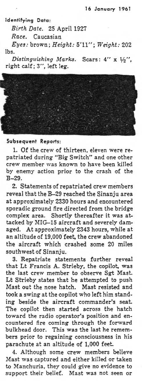 On July 3, 1952, an RB-29 Superfortress (serial number 44-61727, nickname "So Tired") with thirteen crew members took off from Yokota Air Base, Japan, on a classified nighttime reconnaissance mission over North Korea. During the mission, "So Tired" was illuminated by enemy searchlights and attacked by a MiG-15 fighter, which inflicted severe damage. Eleven of the thirteen crew members bailed out before the aircraft crashed but were captured by the enemy and eventually returned to U.S. custody. The other two crew members were killed either by fire from the MiG or in the subsequent crash. Staff Sergeant Clifford Henry Mast, who entered the U.S. Air Force from Washington, served in the 91st Strategic Reconnaissance Squadron. He was the nose gunner aboard "So Tired" at the time of its loss on July 3, 1952, and his body was reportedly found in the wreckage by enemy personnel but details of any burial are unknown. He remains unaccounted-for. Today, Staff Sergeant Mast is memorialized on the Courts of the Missing at the National Memorial Cemetery of the Pacific. Based on all information available, DPAA assessed the individual's case to be in the analytical category of Deferred. If you are a family member of this serviceman, DPAA can provide you with additional information and analysis of your case. Please contact your casualty office representative. |
