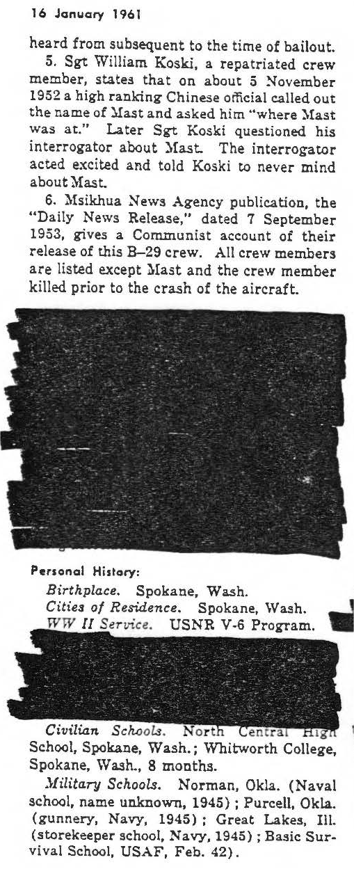 information. (FEBRUARY 1992) Clifford Mast is listed on the "HONOR ROLL OF FORGOTTEN AMERICANS" yet is noted as having died "while missing" by the National Archive. |