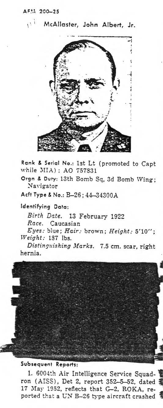 information. (FEBRUARY 1992) John Mc Allaster Jr. is listed on the "HONOR ROLL OF FORGOTTEN AMERICANS" yet is noted as having died "while missing" by the National Archive. |