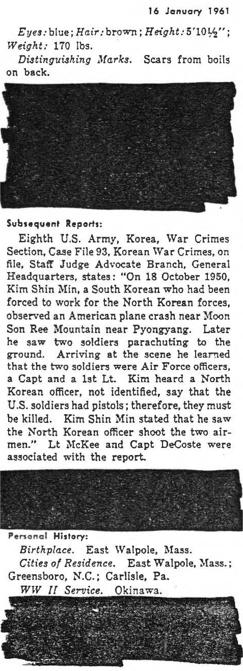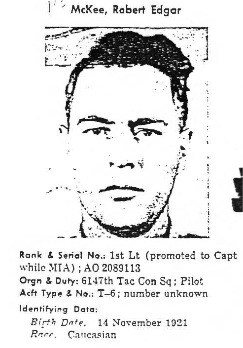 information. (FEBRUARY 1992) Robert McKee is listed on the "HONOR ROLL OF FORGOTTEN AMERICANS" yet is noted as having died "while missing" by the National Archive. |