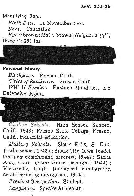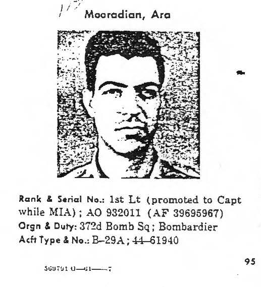 Early in the morning on October 23, 1951, a B-29A Superfortress (tail number 44-61940) with a crew of thirteen took off from Kadena Air Base, Okinawa, as part of group of nine B-29s with fighter support. The briefed mission was a daylight bombing operation targeting the Namsi Air Field, northwest of Pyanghyon, North Korea. As the Superfortress was departing the target area, it was attacked by enemy MiG-15 fighters, inflicting severe damage on the aircraft. The pilot managed to get the aircraft to the bay, but shortly after he gave the bailout order, the B-29 crashed in the water approximately seven miles off the coast of Chongu. Shortly after the crash, the copilot was rescued by an Australian frigate, and the body of another crew member was located and identified a few days later. Five other crew members were captured by the enemy and were returned after the war. The remaining six airmen from this loss are still unaccounted for. Captain Ara Mooradian, who joined the U.S. Air Force from California, was a member of the 372nd Bombardment Squadron, 307th Bombardment Wing (Medium). He was serving as the bombardier aboard this B-29 when it went down in the Korea Bay. He was not seen or heard from again following the loss of the aircraft, and he remains unaccounted for. Today, Captain Mooradian is memorialized on the Courts of the Missing at the National Memorial Cemetery of the Pacific. Based on all information available, DPAA assessed the individual's case to be in the analytical category of Deferred. If you are a family member of this serviceman, DPAA can provide you with additional information and analysis of your case. Please contact your casualty office representative. |