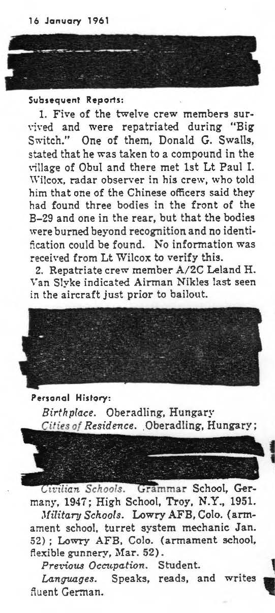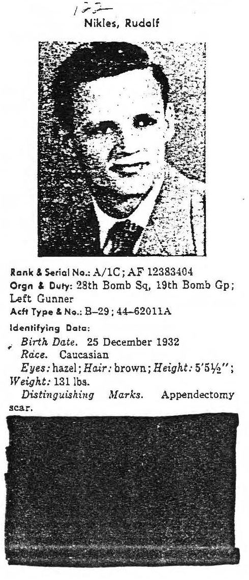 Airman First Class Rudolf Nikles, who entered the U.S. Air Force from New York, served with the 28th Bombardment Squadron, 19th Bombardment Group (Medium). He was a left gunner aboard this Superfortress and was one of the men lost with the aircraft. No returning POWs mentioned contact with A1C Nikles, nor was he seen at any known holding point, interrogation center, hospital, or permanent POW camp. He remains unaccounted-for. Today, Airman First Class Nikles is memorialized on the Courts of the Missing at the National Memorial Cemetery of the Pacific.