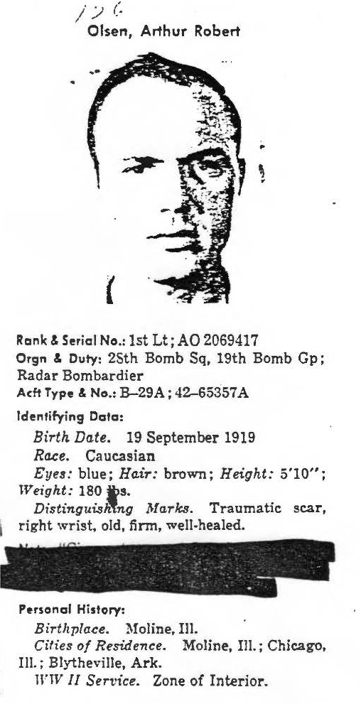 On the evening on January 28, 1953, a B-29 Superfortress (tail number 42-65357A) with a crew of fourteen departed Kadena Air Base in a flight of four. The briefed mission was a night bombing operation targeting the Kompo-Dong supply yard south of Pyongyang, North Korea. Shortly after releasing its payload, the B-29 was attacked by enemy MiG-15 fighters. Just after midnight, the aircraft commander made a distress call and ordered the crew to bail out. A few minutes later, witnesses reported the Superfortress caught fire and exploded in midair near Hungsu-ri. It is believed that five airmen were still aboard the aircraft when it exploded. The nine surviving crew members were captured by the North Koreans; three of them were returned to U.S. custody following the war, and one is known to have died at the Pike’s Peak prisoner interrogation center. While being moved in a convoy to a holding site, the remaining five prisoners were "liberated" by a group of Korean irregulars, believed to be North Koreans masquerading as South Korean guerrillas. Later that day, the B-29’s Aircraft Commander (Captain Gilbert Ashley) was allowed to contact United Nations Forces. On April 24, U.S. forces attempted to rescue the five men, but the rescue aircraft was fired upon during the attempt and the efforts were abandoned. Later reporting revealed the loyalty of the guerrilla unit and the probability that it had used the prisoners as bait. The five prisoners became known as the “Ashley 5,” after the Aircraft Commander, and all five of them remain unaccounted-for, along with the five who were believed to be aboard the plane when it exploded and the one who died at the Pike's Peak center. First Lieutenant Arthur Robert Olsen, who joined the U.S. Air Force from Arizona, was assigned to the 28th Bombardment Squadron, 19th Bombardment Group. He was the radar bombardier aboard this Superfortress when it went down, and was among survivors known as the Ashley 5. Further attempts to locate him have been unsuccessful and he is still unaccounted-for. Today, First Lieutenant Olsen is memorialized on the Courts of the Missing at the National Memorial Cemetery of the Pacific. Based on all information available, DPAA assessed the individual's case to be in the analytical category of Deferred. If you are a family member of this serviceman, DPAA can provide you with additional information and analysis of your case. Please contact your casualty office representative. |