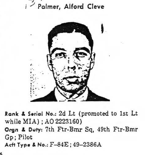 information. (FEBRUARY 1992) Alford Palmer is listed on the "HONOR ROLL OF FORGOTTEN AMERICANS" yet is noted as having died "while missing" by the National Archive. |