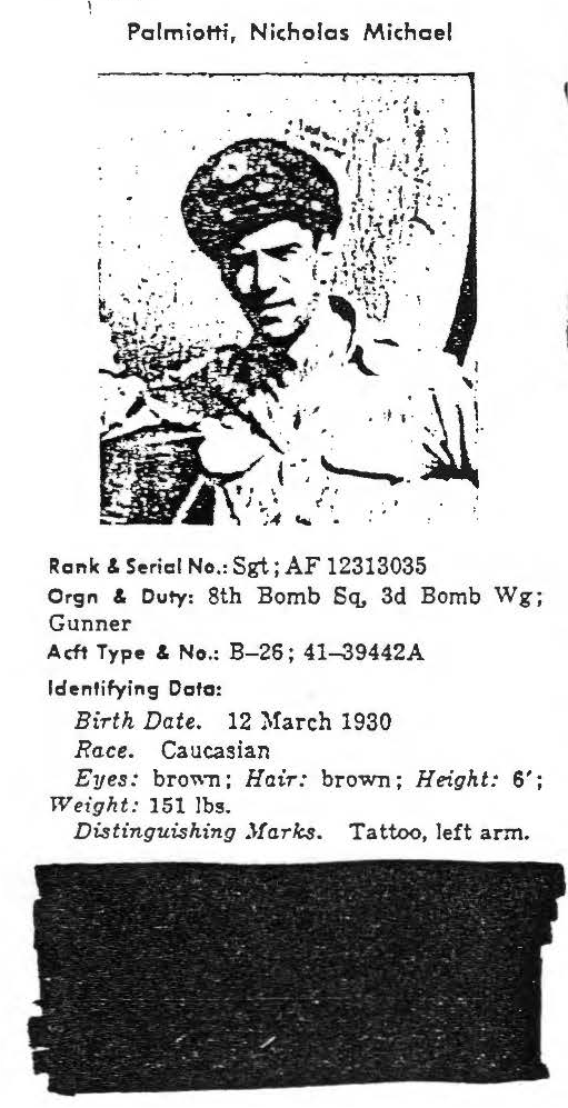 On August 30, 1951, a B-26B Invader (tail number 41-39442A, call sign "Skillful 13”) carrying three crew members took off from Kunsan Airdrome, South Korea, as one of three aircraft on a low-level night intruder mission against enemy targets on roads and rail lines between Sariwon and Pyongsan, North Korean. Two of the aircraft dropped their ordnance and returned to base; however, the crew of "Skillful 13" radioed they would remain in the area to expend its remaining ordnance. Approximately one and a half hours after it arrived in the target area, this aircraft reported it was returning to base, but no further radio contact was made. When the aircraft was overdue to its home base, an air search was initiated but found no trace of the missing B-26 or its crew; however, three parachutes were observed on the ground near the B-26's last reported position in the air, which were suspected to be those of the crew of Skillful 13. Staff Sergeant Nicholas Michael Palmiotti entered the U.S. Air Force from New Jersey and served with the 8th Bombardment Squadron, 3rd Bombardment Group (Light). He was the tail gunner aboard this Invader when it was lost, and he went missing with the aircraft. No returning POWs mentioned having contact with SSgt Palmotti, nor was he seen at any known holding point, interrogation center, hospital, or permanent POW camp. He remains unaccounted-for. Today, Staff Sergeant Palmiotti is memorialized on the Courts of the Missing at the National Memorial Cemetery of the Pacific. Based on all information available, DPAA assessed the individual's case to be in the analytical category of Active Pursuit. If you are a family member of this serviceman, DPAA can provide you with additional information and analysis of your case. Please contact your casualty office representative. |