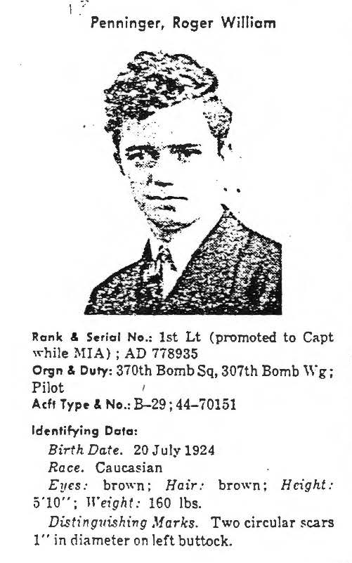 information. (FEBRUARY 1992) Roger Penninger is listed on the "HONOR ROLL OF FORGOTTEN AMERICANS" yet is noted as having died "while missing" by the National Archive. |