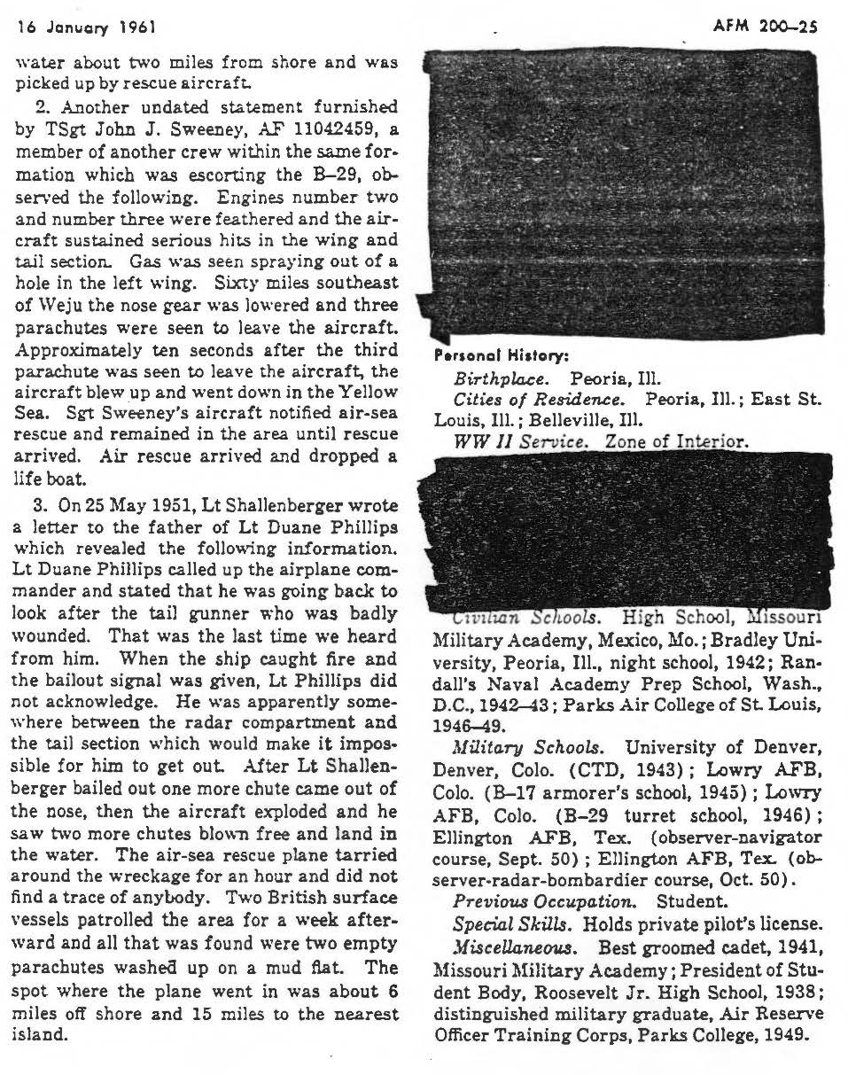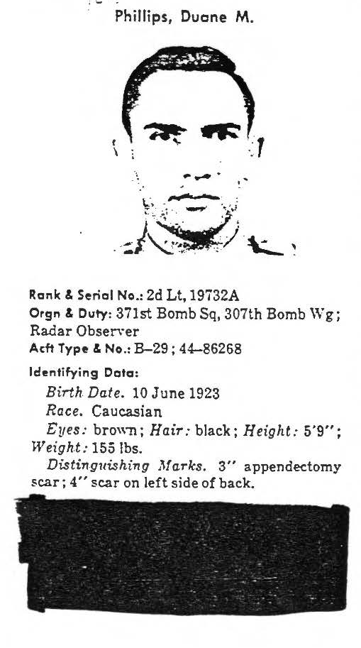 Early in the morning on April 7, 1951, a B-29 Superfortress (tail number 44-86268) with a crew of eleven aviators departed Kadena Air Base, Japan, as part of a 36-Superfortess strike force. The briefed mission was a daylight bombing operation targeting the highway and railroad bridges near Uiju, which crossed the Yalu River between North Korea and China. Just before releasing its bombs, the Superfortress was attacked by enemy fighters, sustaining severe damage including the loss of two engines and its communications systems. In hopes of reaching friendly territory, the pilot began flying south along the west coast, but a fire broke out in the rear bomb bay. Realizing that the B-29 could no longer sustain flight, the pilot turned out over the water toward a rescue ship, and the aircraft commander gave the order for the crew to bail out. Three parachutes were seen to emerge from the aircraft before it exploded in mid-air and crashed into the water. An extensive search of the area located one of the eleven aviators on board. First Lieutenant Duane Martin Phillips, who joined the U.S. Air Force from Illinois, was assigned to the 371st Bombardment Squadron, 307th Bombardment Group. He was the radar observer aboard this Superfortress when it was lost. No returning POWs mentioned contact with 1st Lt Phillips, nor was he seen at any known holding point, interrogation center, hospital, or permanent POW camp. He remains unaccounted-for. Today, First Lieutenant Phillips is memorialized on the Courts of the Missing at the National Memorial Cemetery of the Pacific.Based on all information available, DPAA assessed the individual's case to be in the analytical category of Deferred. If you are a family member of this serviceman, DPAA can provide you with additional information and analysis of your case. Please contact your casualty office representative. |