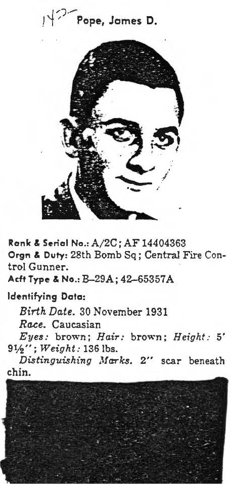 information. (FEBRUARY 1992) James Pope is listed on the "HONOR ROLL OF FORGOTTEN AMERICANS" yet is noted as having died "while missing" by the National Archive. |