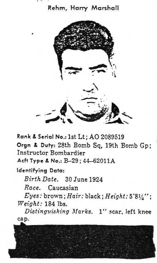 First Lieutenant Harry Marshall Rehm, who entered the U.S. Air Force from New York, was assigned to the 28th Bombardment Squadron, 19th Bombardment Group (Medium). He was the instructor bombardier aboard this B-29 at the time of its loss. No returning POWs mentioned contact with 1st Lt Rehm, nor was he seen at any known holding point, interrogation center, hospital, or permanent POW camp. He remains unaccounted-for. Today, First Lieutenant Rehm is memorialized on the Courts of the Missing at the National Memorial Cemetery of the Pacific. Based on all information available, DPAA assessed the individual's case to be in the analytical category of Deferred. If you are a family member of this serviceman, DPAA can provide you with additional information and analysis of your case. Please contact your casualty office representative. |