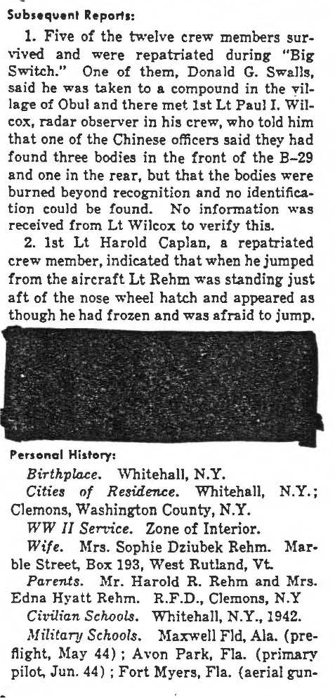 Harry Rehm is listed on the "HONOR ROLL OF FORGOTTEN AMERICANS" yet is noted as having died "while missing" by the National Archive. |