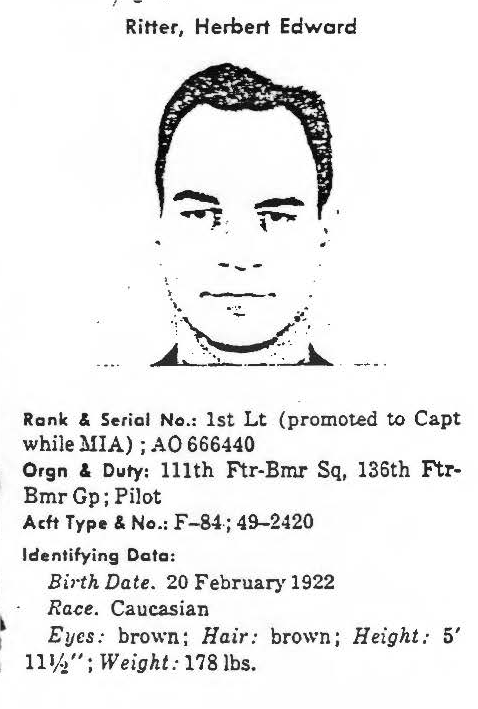 Captain Herbert Edward Ritter entered the U.S. Air Force from Texas and served with the 111th Fighter-Bomber Squadron, 136th Fighter-Bomber Wing. On October 1, 1951, he piloted an F-84E Thunderjet (tail number 49-2420) that took off from Taegu Air Base (K-2), Korea, as third of four aircraft on a rail-cutting operation near Chang-ju, North Korea. While in the target area, his F-84 was attacked by enemy aircraft and was hit. Capt Ritter was observed to bail out of the aircraft, but no signs of survival were witnessed when he landed. The flight searched for him until they were forced to depart the area due to low fuel. No returning POWs mentioned having contact with Capt Ritter, nor was he seen at any known holding point, interrogation center, hospital, or permanent POW camp. He remains unaccounted-for. Today, Captain Ritter is memorialized on the Courts of the Missing at the National Memorial Cemetery of the Pacific. Based on all information available, DPAA assessed the individual's case to be in the analytical category of Deferred. If you are a family member of this serviceman, DPAA can provide you with additional information and analysis of your case. Please contact your casualty office representative. |
