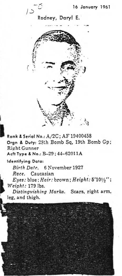 information. (FEBRUARY 1992) Daryl Rodney is listed on the "HONOR ROLL OF FORGOTTEN AMERICANS" yet is noted as having died "while missing" by the National Archive. |