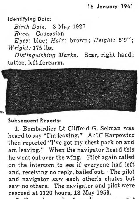 information. (FEBRUARY 1992) Clifford Selman is listed on the "HONOR ROLL OF FORGOTTEN AMERICANS" yet is noted as having died "while missing" by the National Archive. |