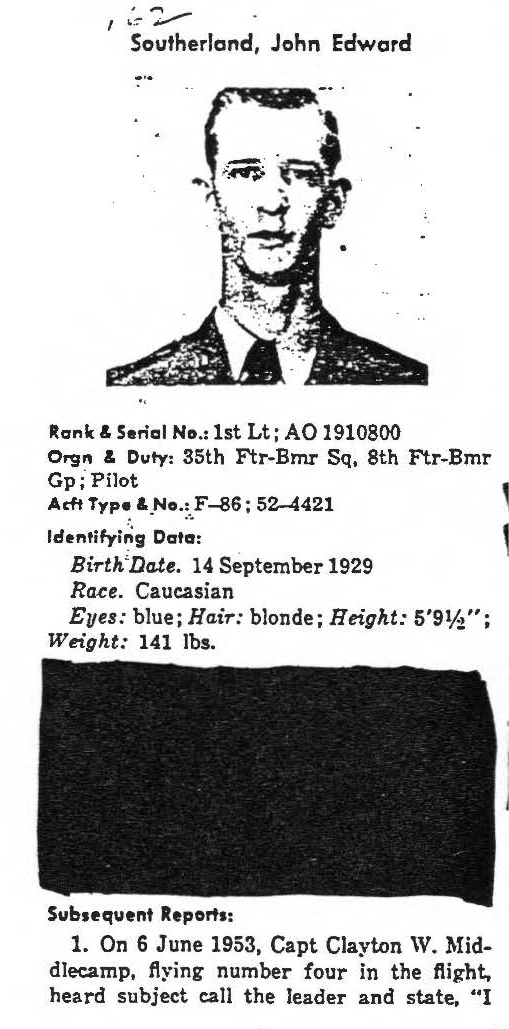 First Lieutenant John Edward Southerland, who entered the U.S. Air Force from Georgia, served in the 35th Fighter-Bomber Squadron, 8th Fighter-Bomber Group. On June 6, 1953, he piloted an F-86 Sabre (tail number unknown) as the second in a flight of four on a close air support mission over the "Charle Tare" area in North Korea. While over the target, 1st Lt Southerland radioed that his aircraft was experiencing engine trouble and he was ordered to abort his pass and wait for the other aircraft to escort him to safety. Shortly after, his Sabre caught fire and he successfully ejected; however, there was enemy flak in the area where his parachute was descending and he disappeared from view. The other pilots made low-level passes over the area of his possible landing, and search and rescue operations were immediately launched but did not locate him. Searchers were soon driven off by enemy anti-aircraft fire. No returning POWs mentioned having contact with 1st Lt Sullivan, nor was he seen at any known holding point, interrogation center, hospital, or permanent POW camp. He remains unaccounted-for. Today, First Lieutenant Southerland is memorialized on the Courts of the Missing at the National Memorial Cemetery of the Pacific. Based on all information available, DPAA assessed the individual's case to be in the analytical category of Deferred. If you are a family member of this serviceman, DPAA can provide you with additional information and analysis of your case. Please contact your casualty office representative. |