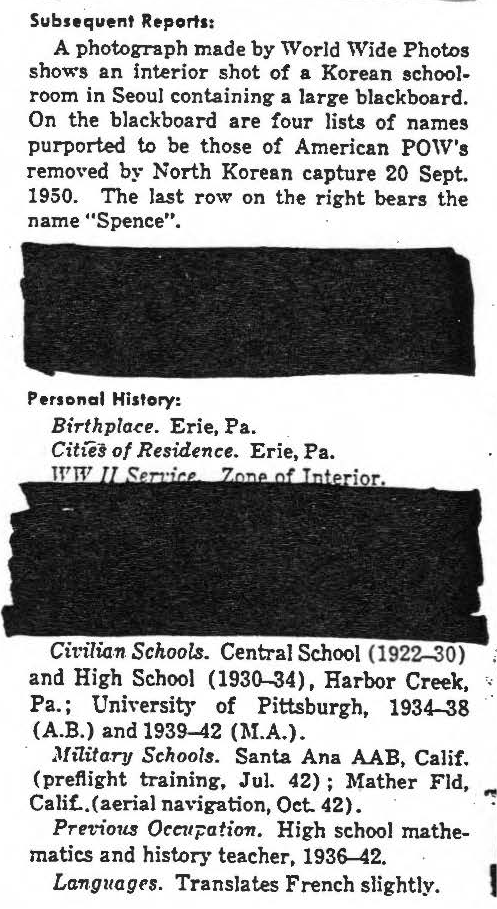 On 9 September 1950, a B-29 Superfortress (tail number 44-62084, nicknamed "Little Mike") with a crew of eleven took off from Yokota Air Base in Japan for an eight-aircraft bombing operation, targeting railroads, highways and bridges from Haeju to Pyongyang and Samsung-ni, North Korea. While making a run over its last target near Anju, the Superfortress took a direct hit from enemy anti-aircraft fire, causing in a large fuel leak. The plane exploded and went down northeast of the village of Wolbong-ni. Witnesses reported seeing several parachutes emerge from the aircraft prior to the explosion. Once allied forces pushed into North Korea, the remains of four members of “Little Mike’s” crew were recovered near the crash site and buried in a temporary United Nations (UN) cemetery located in Pyongyang. Before US forces could transport the remains to the US, Chinese Communist Forces entered the war forcing the U.S. out of North Korea, and the United Nations Command lost control of the Pyongyang cemetery. At least one member “Little Mike’s” crew was held as a prisoner of war, and is thought to have died at some point in captivity. In September 1954, one set of remains from this crew, buried at the temporary cemetery in Pyongyang, was positively identified and returned to his family. At this time, we do not know if other members of this aircrew are among the unknowns now buried at the National Memorial Cemetery of the Pacific located in Hawaii. Major Marvin James Spence entered the U.S. Air Force from Pennsylvania and served with the 325th Bombardment Group (Medium), 92nd Bombardment Wing. He was the navigator aboard this Superfortress when it was shot down September 9, 1950, and it is unknown whether he survived the incident. No returning POWs mentioned contact with Major Spence, nor was he seen at any known holding point, interrogation center, hospital, or permanent POW camp. He remains unaccounted-for. Today, Major Spence is memorialized on the Courts of the Missing at the National Memorial Cemetery of the Pacific. Based on all information available, DPAA assessed the individual's case to be in the analytical category of Deferred. If you are a family member of this serviceman, DPAA can provide you with additional information and analysis of your case. Please contact your casualty office representative. |