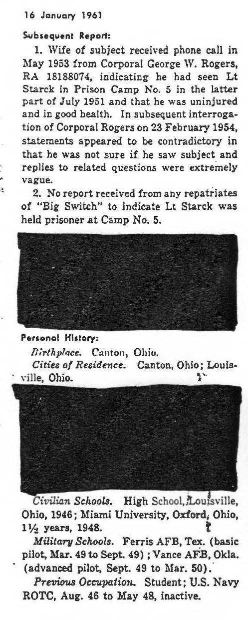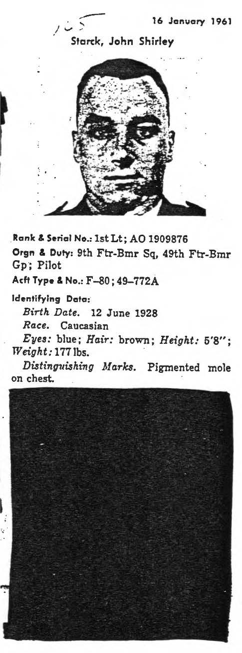 information. (FEBRUARY 1992) John Starck is listed on the "HONOR ROLL OF FORGOTTEN AMERICANS" yet is noted as having died "while missing" by the National Archive. |
