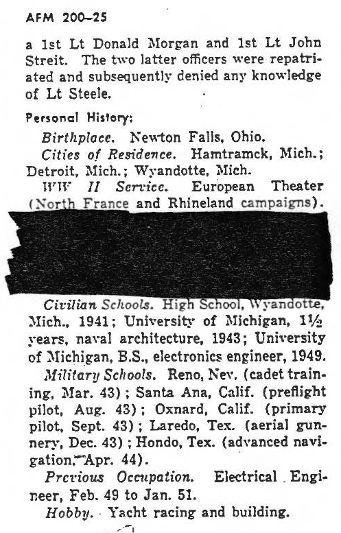 information. (FEBRUARY 1992) Robert Steele is listed on the "HONOR ROLL OF FORGOTTEN AMERICANS" yet is noted as having died "while missing" by the National Archive. |