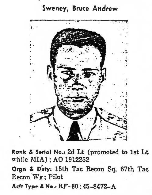 First Lieutenant Bruce Andrew Sweney entered the U.S. Air Force from Illinois and served with the 15th Tactical Reconnaissance Squadron, 67th Tactical Reconnaissance Wing. On October 2, 1951, he piloted an RF-80C Shooting Star (tail number 45-3472A, call sign “Bonnie Phyl”) that departed Kimpo Air Base, Korea, on a photographic reconnaissance mission over Sinanju, North Korea, accompanied by six escort F-84 Thunderjets. During the mission, 1st Lt Sweney's aircraft was hit by attacking enemy MiG-15s, exploding in midair before crashing. The escort pilots made several low-level passes over the crash site and observed a parachute with 1st Lt Sweney attached, but he appeared unresponsive. Search aircraft returned the next morning but saw no trace of the downed pilot, who was not seen again. No returning POWs mentioned having contact with 1st Lt Sweney, nor was he seen at any known holding point, interrogation center, hospital, or permanent POW camp. He remains unaccounted-for. Today, First Lieutenant Sweney is memorialized on the Courts of the Missing at the National Memorial Cemetery of the Pacific. Based on all information available, DPAA assessed the individual's case to be in the analytical category of Deferred. If you are a family member of this serviceman, DPAA can provide you with additional information and analysis of your case. Please contact your casualty office representative. |
