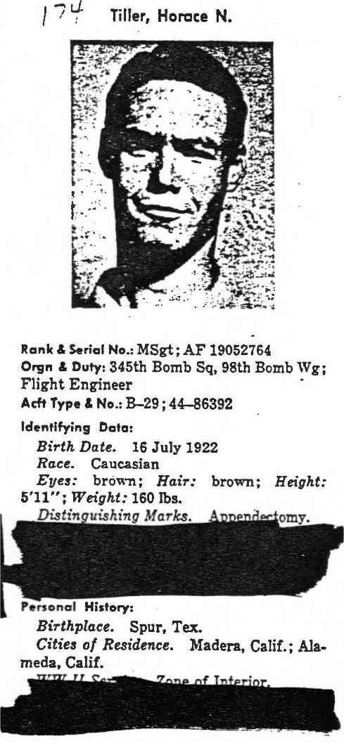 information. (FEBRUARY 1992) Horace Tiller is listed on the "HONOR ROLL OF FORGOTTEN AMERICANS" yet is noted as having died "while missing" by the National Archive. |