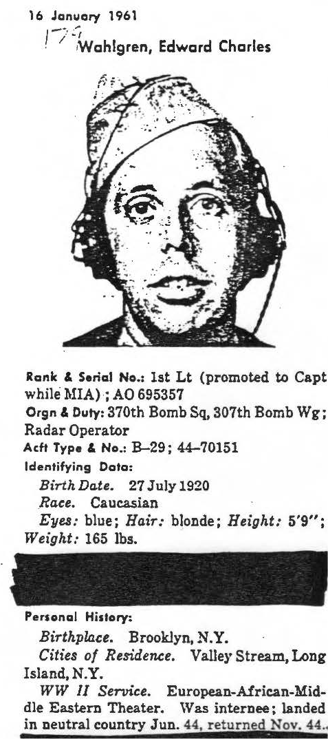 information. (FEBRUARY 1992) Edward Wahlgren is listed on the "HONOR ROLL OF FORGOTTEN AMERICANS." |